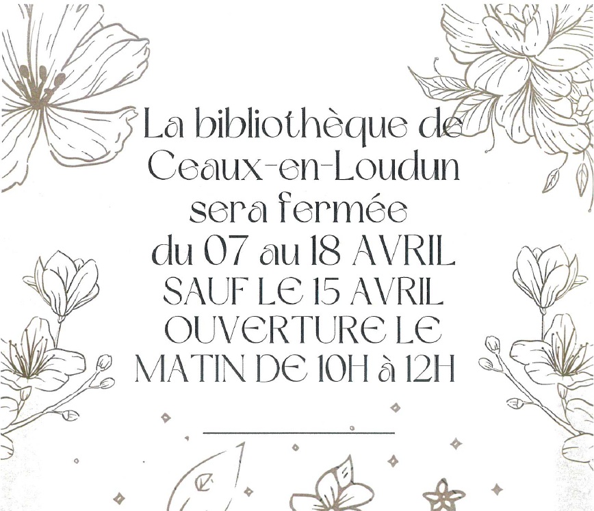 Fermeture Bibliothèque du 07 au 18 avril 2026, sauf le 15 avril Fermeture Bibliothèque du 07 au 18 avril 2026, sauf le 15 avril 8 avril 2026 adminmairie